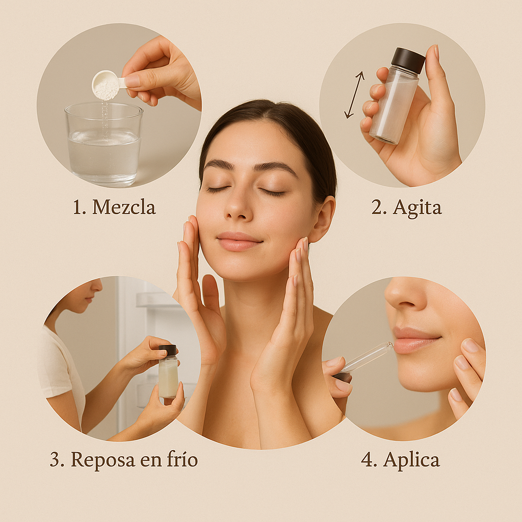 ¡Súper fácil! Solo mezcla media cucharada(0,5 g)en tu tarro con (100ml) de agua destilada, deja la tapa no cerrado del frasco y déjalo en la nevera 6– 12 h. No hace falta báscula: la cuchara dosificadora marca la cantidad exacta.